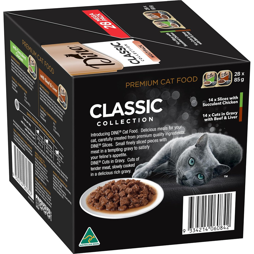 Delight your feline with the DINE® Classic Collection Chicken Slices & Beef & Liver in Gravy 28-pack, a premium wet cat food multipack crafted to satisfy even the pickiest appetites. Developed with quality ingredients and rich, savoury gravy, this variety pack offers generous portions of tender slices and cuts that cats love.