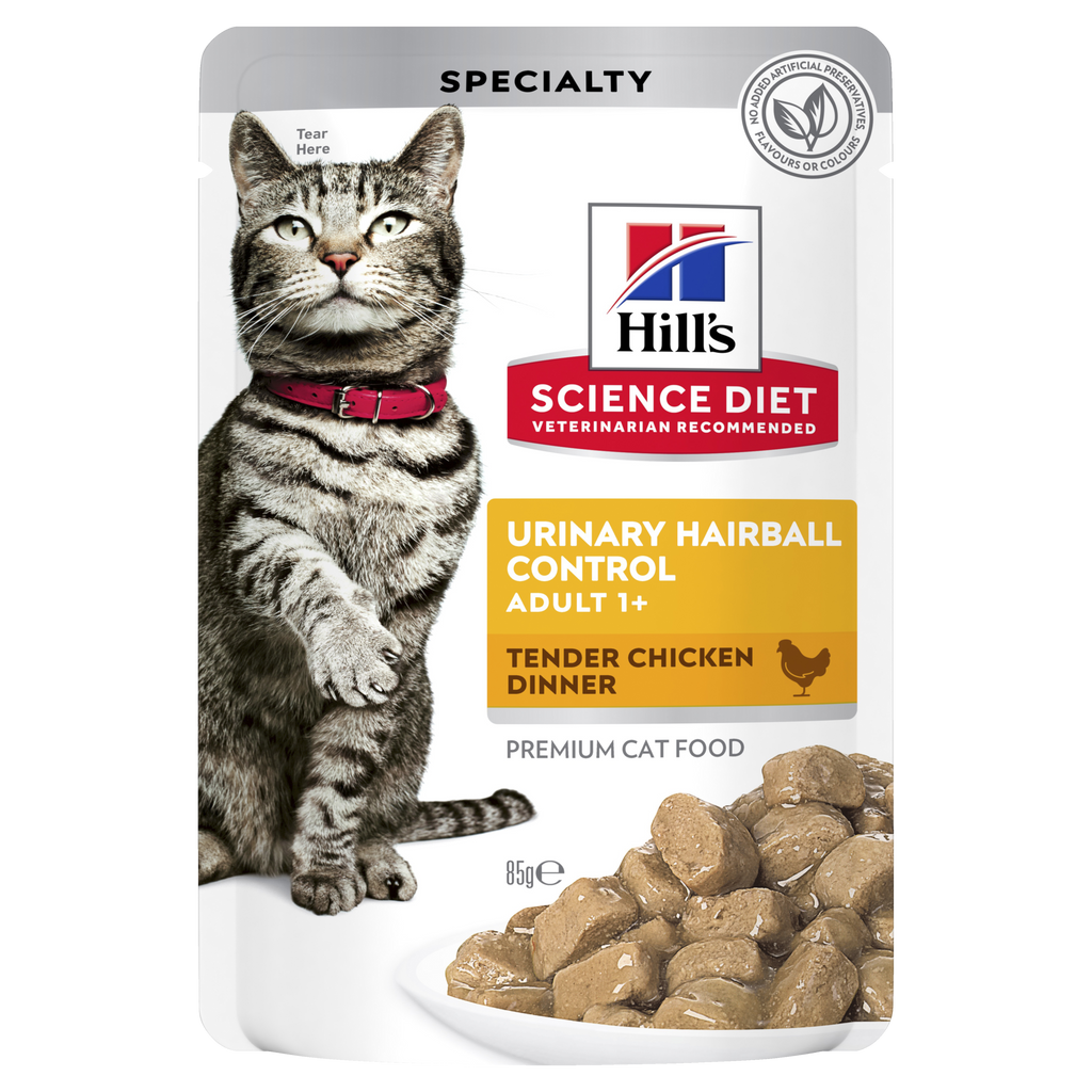 Hill's Science DietAdult Urinary Hairball Control Chicken cat food provides precisely balanced nutrition to help support the health of the whole urinary system while also helping to avoid hairballs.