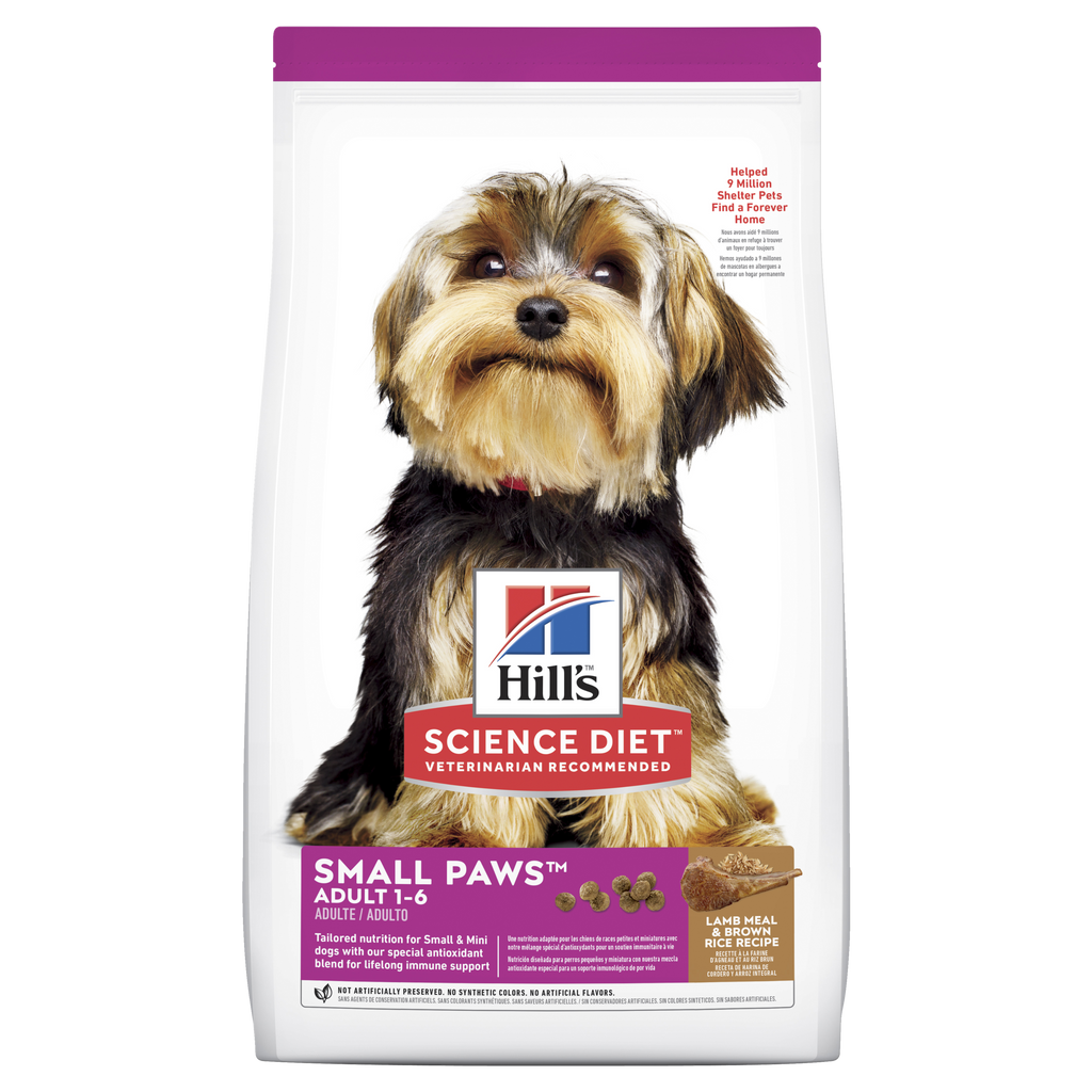 Little dogs have their own needs when it comes to meal time, so give your small breed dog a pet food that big on love, and small in size. Hill's Science Diet Small Paws adult dry dog food is tailored nutrition for the unique needs of small & mini dogs during the prime of their life. Delicious lamb flavour  for those that prefer variety & specially made with nibble size, small kibble. This dog food made with natural ingredients contains omega-6s and vitamin E to nourish your dog's coat and skin. Balanced levels of high-quality protein help your small or little-breed dog maintain lean muscle, while the proprietary antioxidant blend supports the immune system for lifelong health.