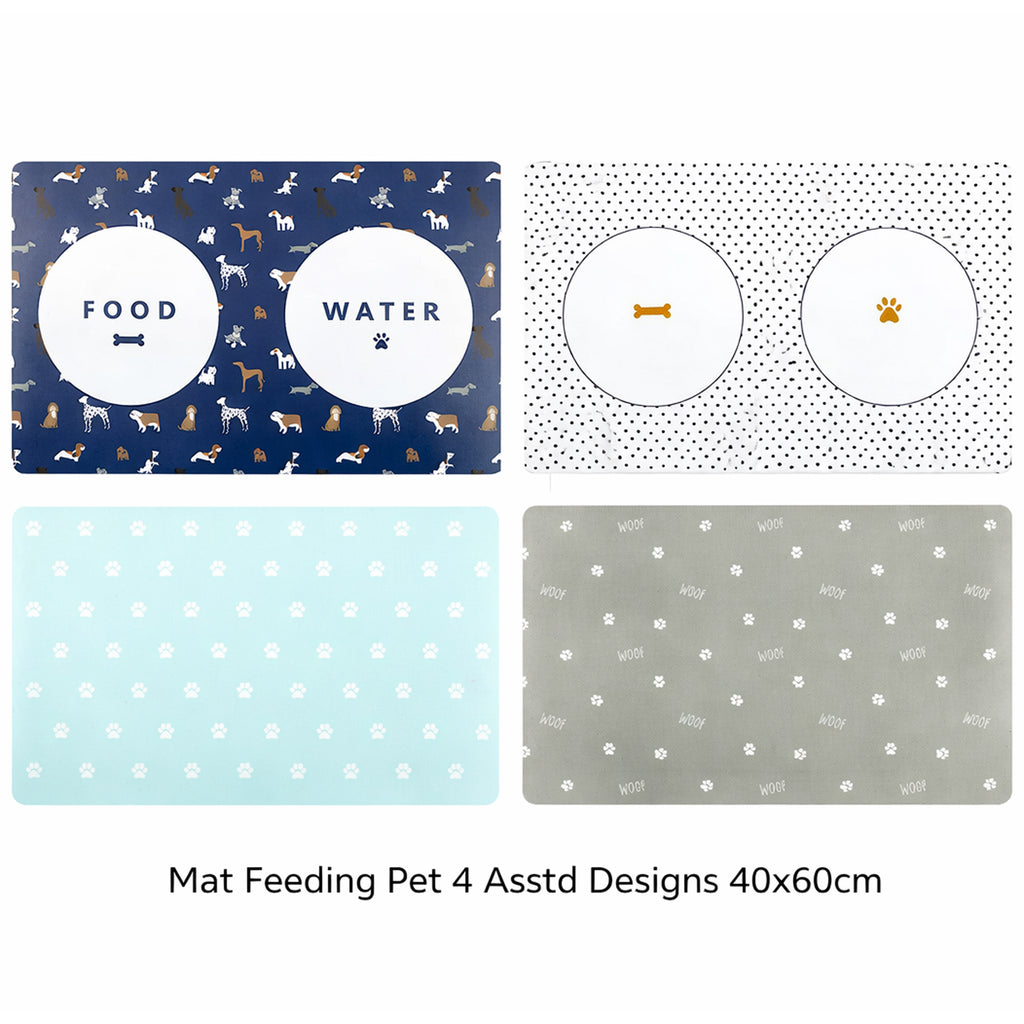 Sized at 40 × 60cm, it provides generous coverage for most bowl setups and suits both dogs and cats. Available in four assorted designs, each mat features a fun and modern pattern to complement any home décor.