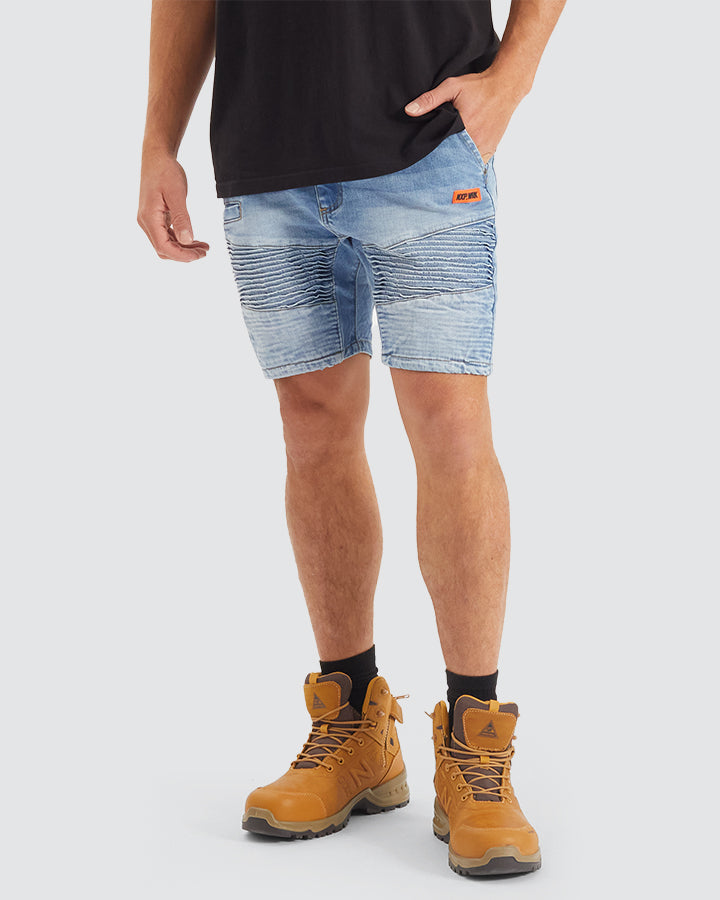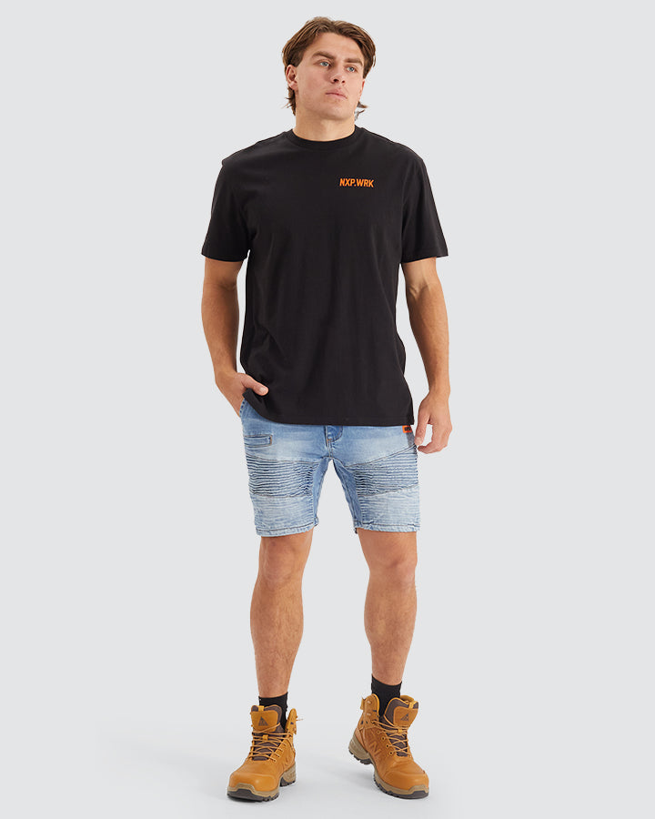 The Bobcat Denim Short from NXP.WRK is durable yet stylish mens work short with two-way stretch denim and triple stitched seams. Featuring a 14oz midweight denim that feels premium but won't hold you back. Throw in a comfortable fit and vintage black shade with washed out finish for that perfectly worn-in streetwear aesthetic. Whether you're on the tools, or on the turps, this summer work wear style has got you covered.