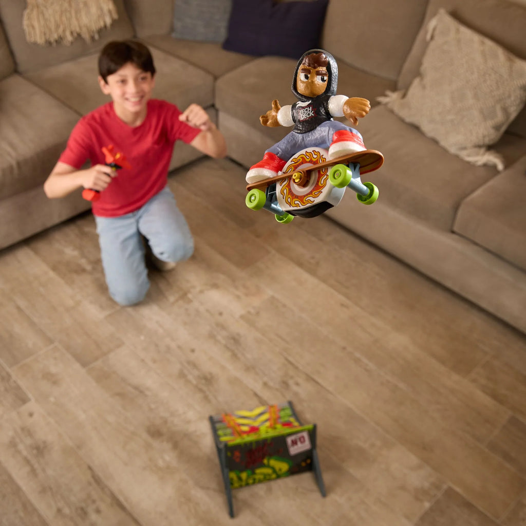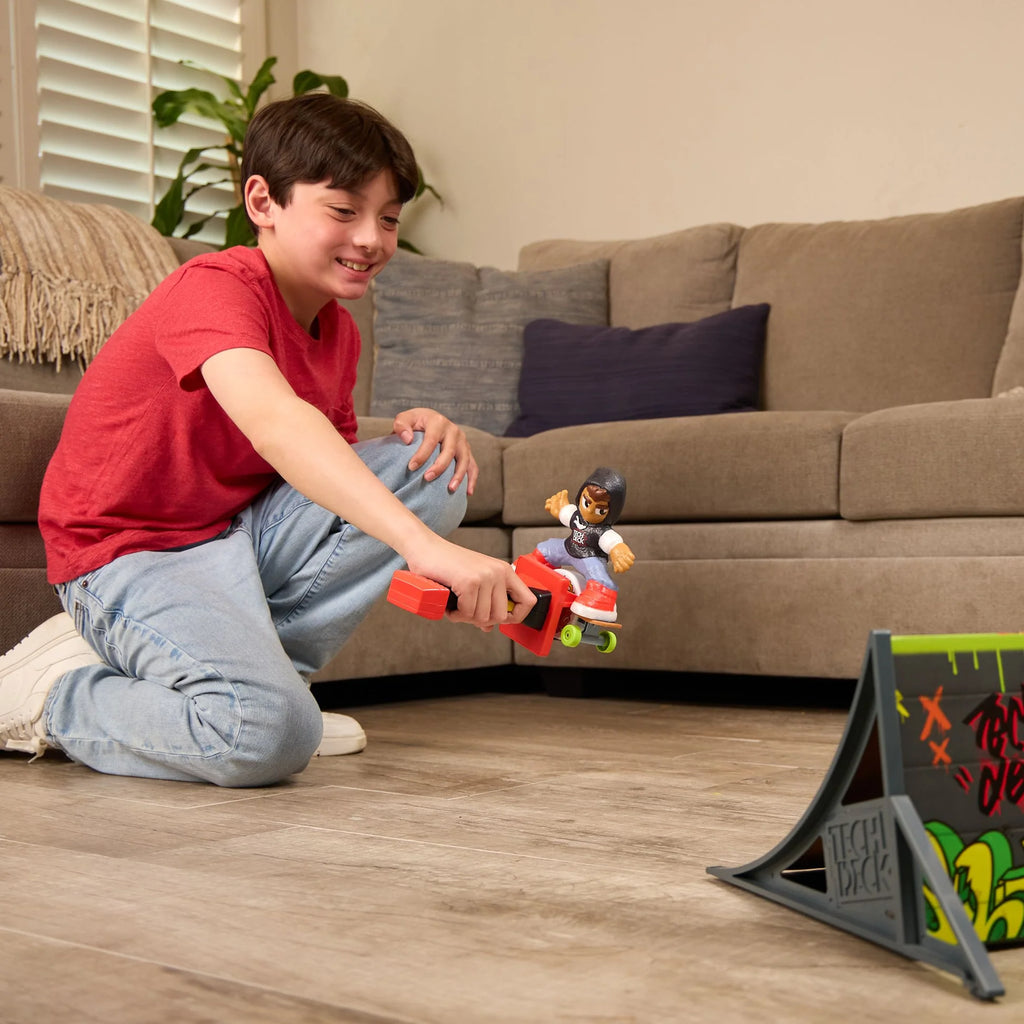 Rev it up using the trick stick, set it loose, and watch the board blast across ramps, floors, and tabletops. Use the included ramp to launch into high jumps or add it to your existing Tech Deck skatepark for even bigger stunts. Whether indoors or out, this motorised fingerboard delivers fast-paced, action-packed fun you can’t do with standard fingerboards.