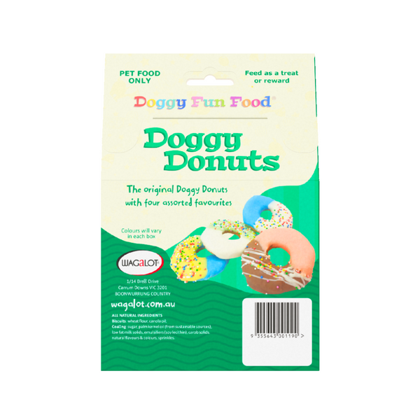 Made with only natural ingredients and containing no nasties, this box of Doggy Donuts treats is sure to make your doggy’s day! Inside you’ll find 4 donut-shaped, all-natural biscuits dipped in a mix of colored vanilla yogurt and carob with sprinkles. They come sealed in a cellophane bag for freshness and are presented in a cute, printed box. Any time or any day can be special for your dog with a Wagalot box of Doggy Donuts treats. *Colors will vary in each box.